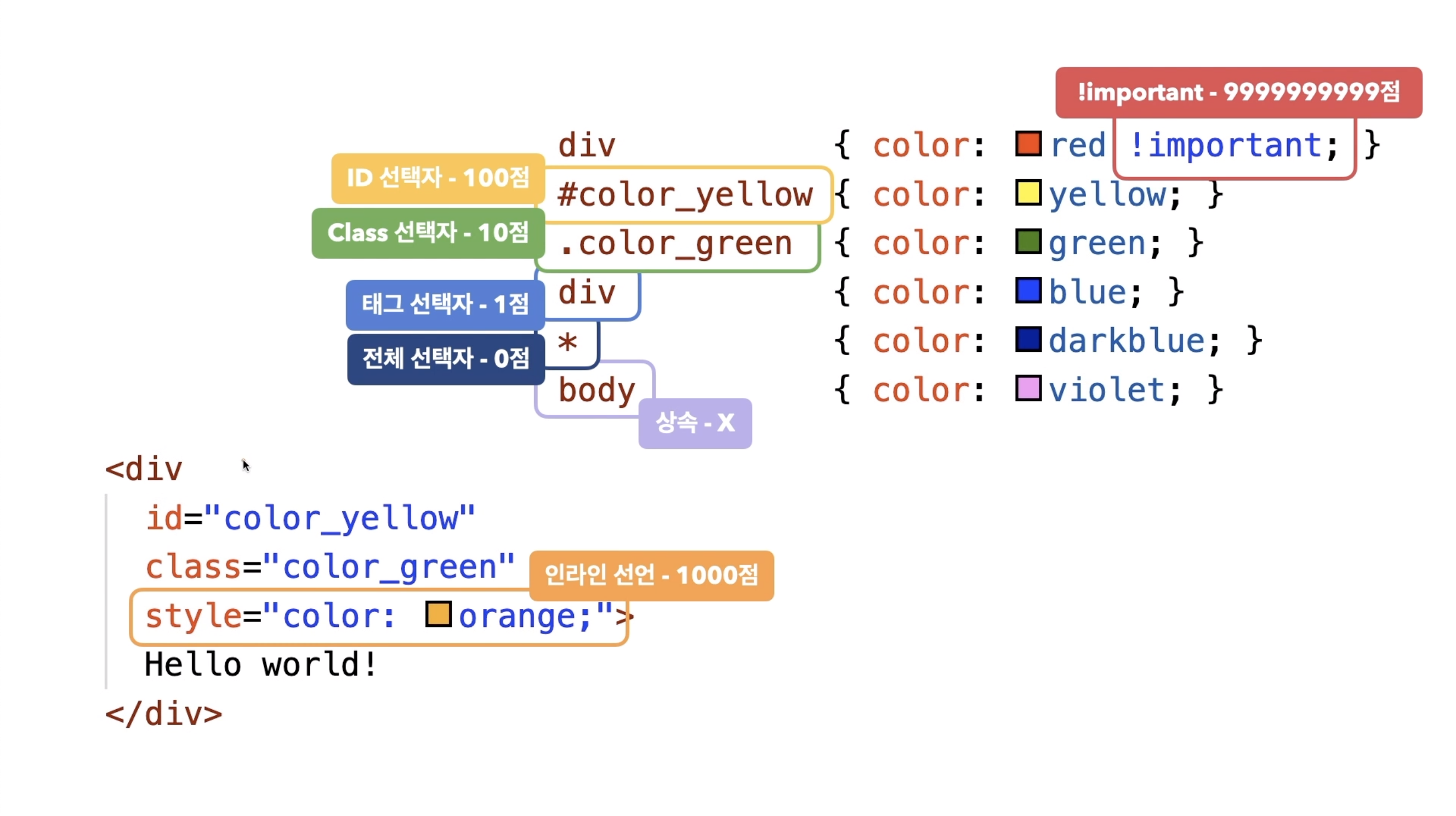 상속 < 전체 < 태그 < 클래스 < 아이디 < 인라인 < !important