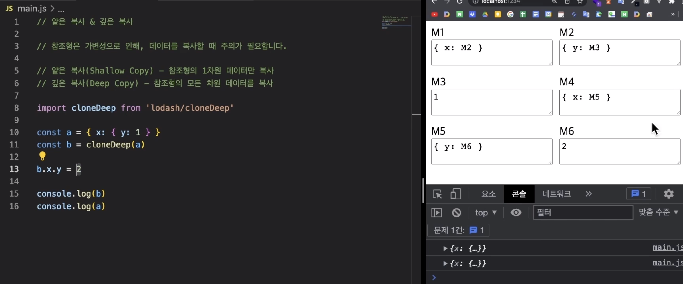 깊은 복사를 위해서는 lodash의 cloneDeep을 사용하자!