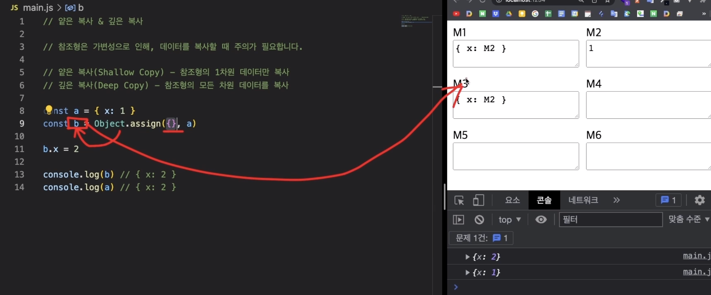 Object.assign(빈 객체, 복사하고 싶은 객체)이나 전개 연산자로 얕은 복사를 할 수 있다.
