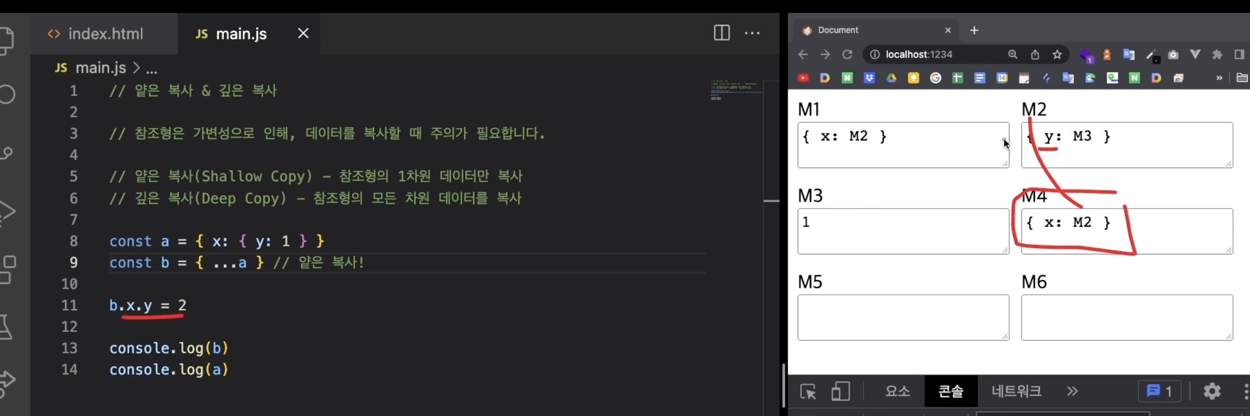 그러나 얕은 복사는 1차원의 데이터만 복사하기 때문에, 고차원의 데이터는 같은 주소를 참조하게 된다.