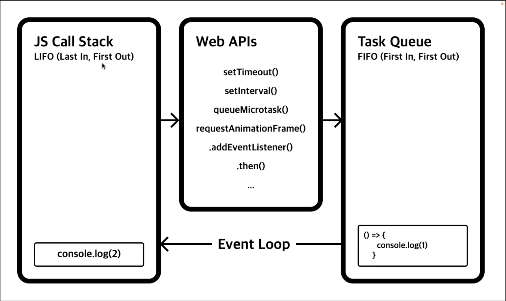 태스크 큐에 쌓인 코드는 콜 스택이 완전히 비워져야 콜 스택에 들어갈 수 있다.